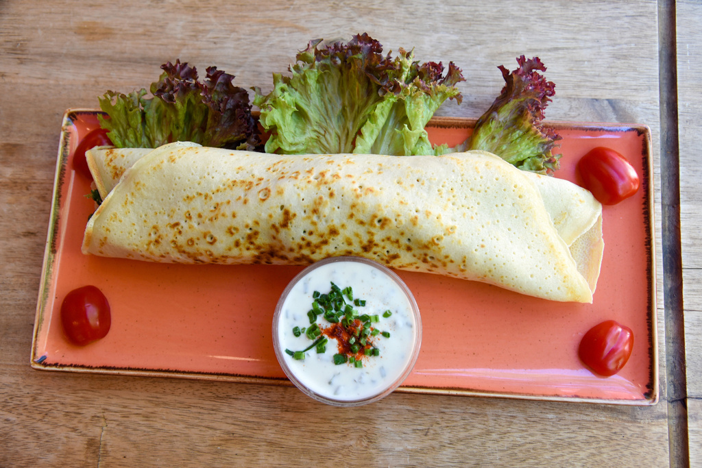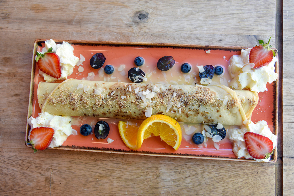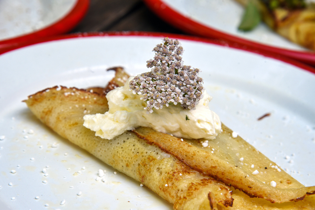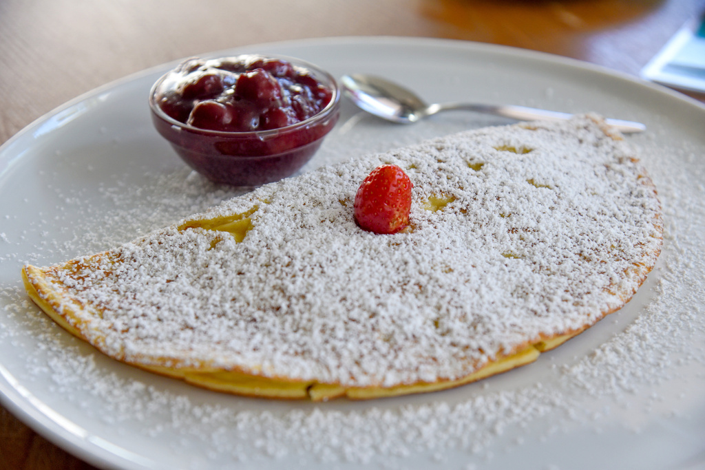 Gefüllt werden die zarten Teigfladen mit Marmelade, Topfen oder Schokoladensauce, bestreut mit gehackten, gerösteten Nüssen und mit Staubzucker, garniert mit einem Tupfer Schlagobers.